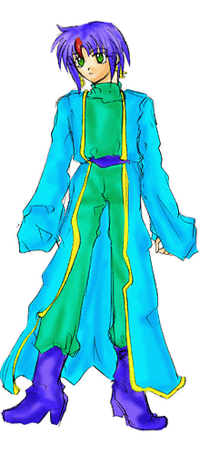 青髪緑目。額右に赤色のメッシュ有。